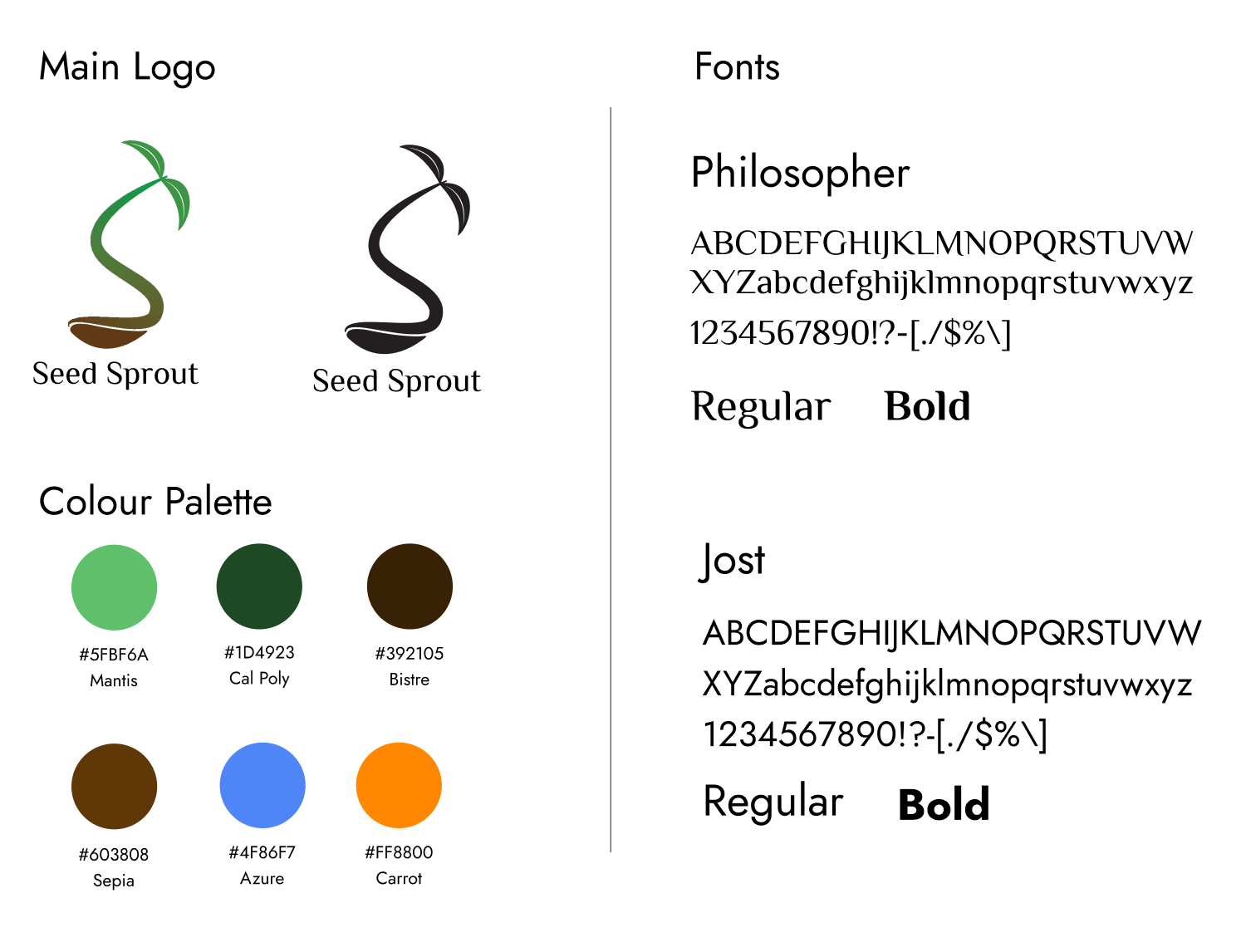 The style guide served as a crucial foundation throughout Seed Sprout's development, providing clear guidelines on the elements that would shape the it's identity. By defining a cohesive colour palette inspired by nature, the style guide ensured that Seed Sprout's identity remained consistent and familiar with its environmental focus. The logo design, representing a seed sprouting reinforces the theme of growth and sustainability, Seed Sprout's main mission.